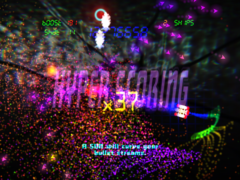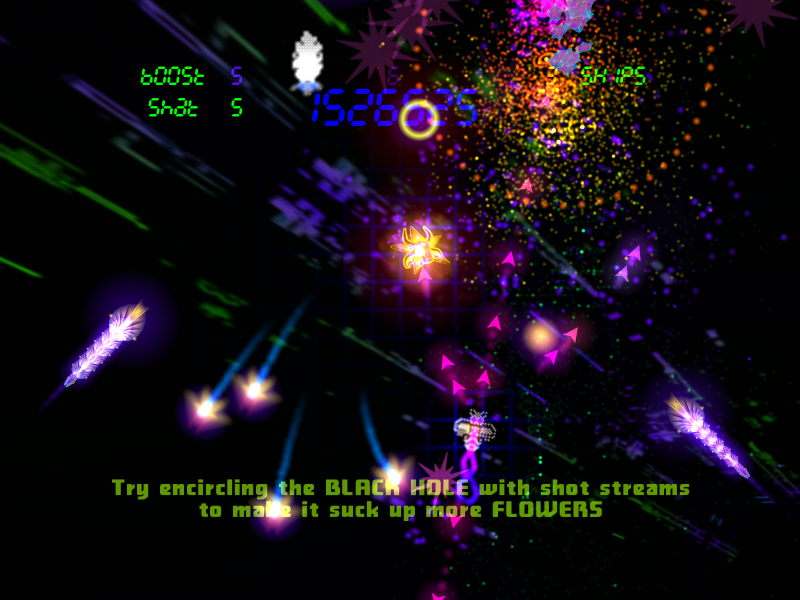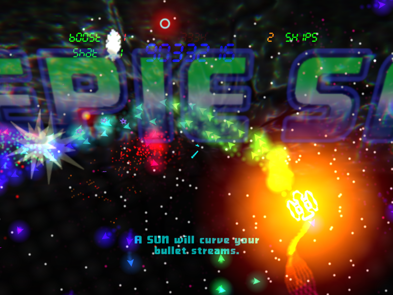 The emphasis on the use of gravity and the coupling of the shape of the bullet streams to scoring leads to an interesting dynamic in the game – one finds oneself balanced between the need to survive from an onslaught of attacks, and the desire to craft a particularly pleasing and auspicious sigil with your bullet streams and their interaction with the gravitic masses.