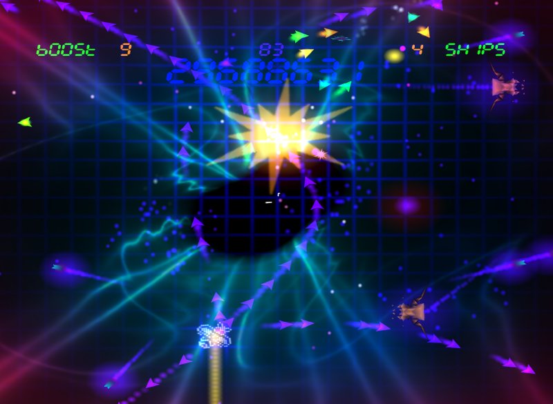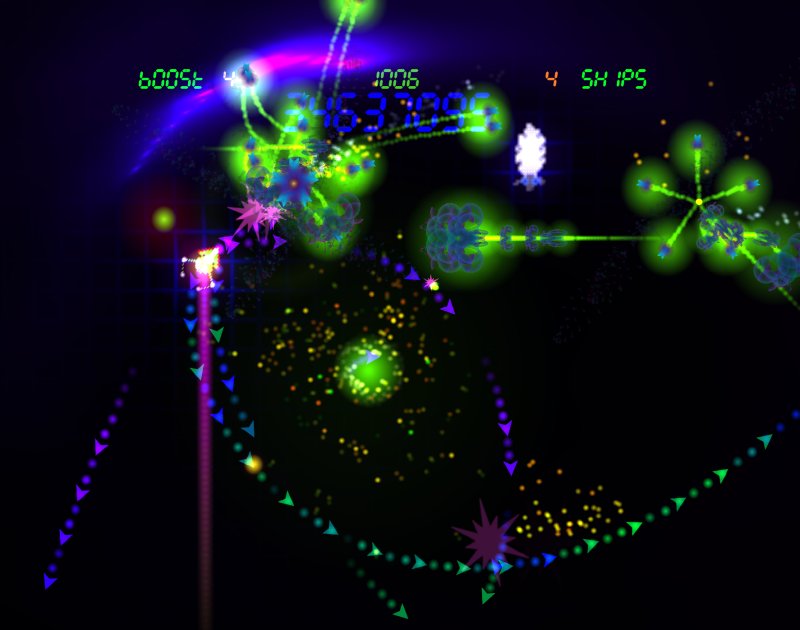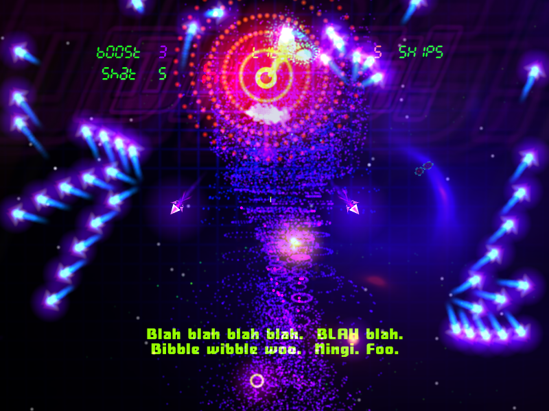 Everything else was pretty much straight out of the old game – the shots are identical as is that “1000” bonus, only drawn with pointsprites instead of raw particles. Also you can’t help but notice that everything is pretty low rez, a byproduct of the fact that at the time we were doing all game object rendering inside the internal Neon stacks, which run at a spatial rez of 512×512.