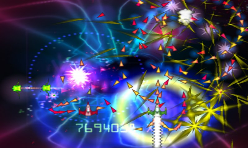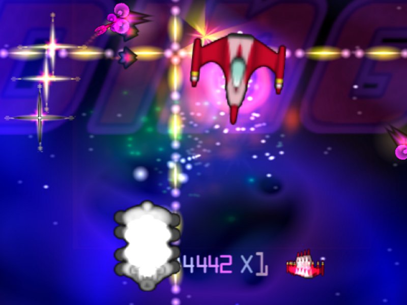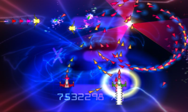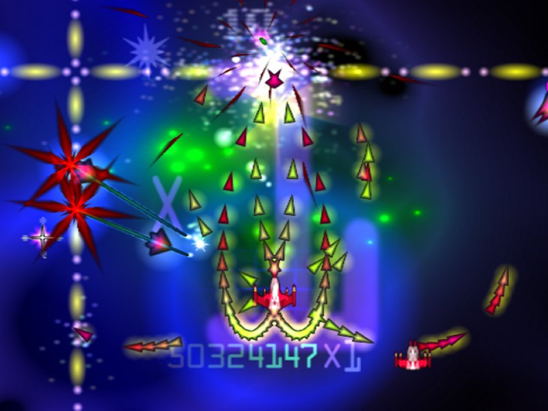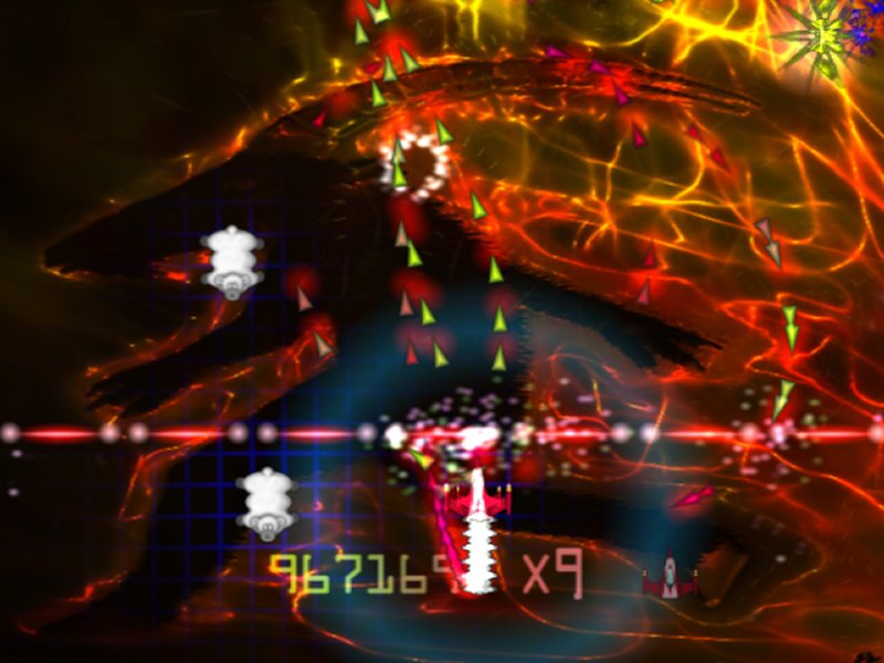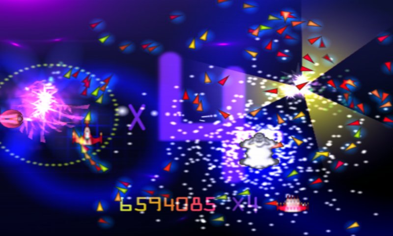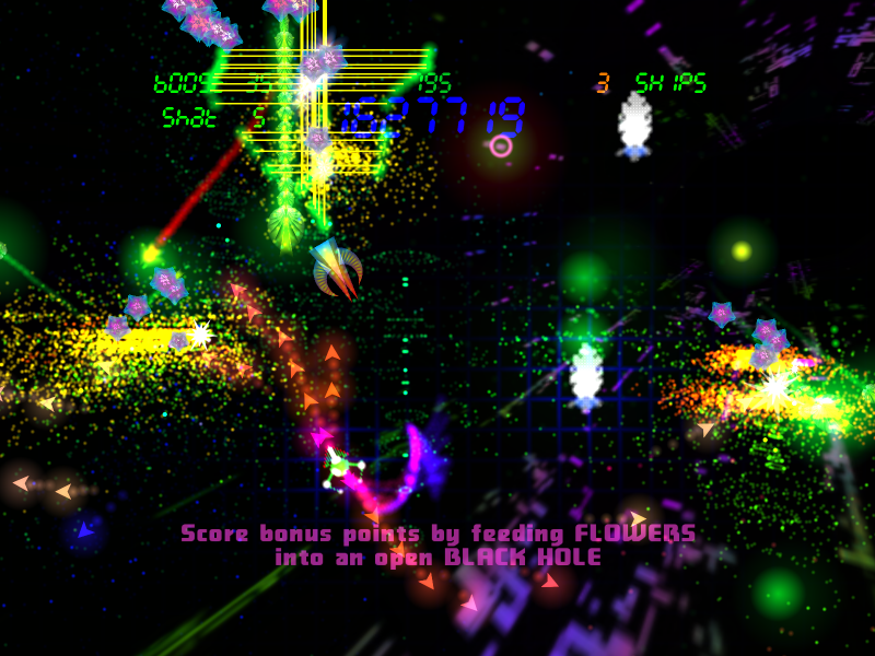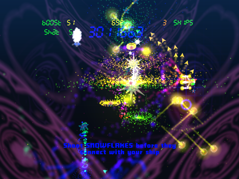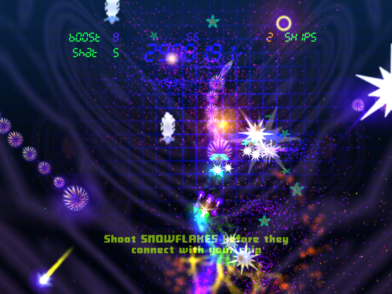 The gameplay was also changing too, becoming very much its own thing rather than a port of GR++. Here we see a nice sm3 background and loads of new gameplay elements on top of it – stepping lasers, Snowflakes, and new guns with very high bullet firing rates. You can still see some stuff remaining from the old game though, in the shape of the “10” bonus qt the top of the screen.
