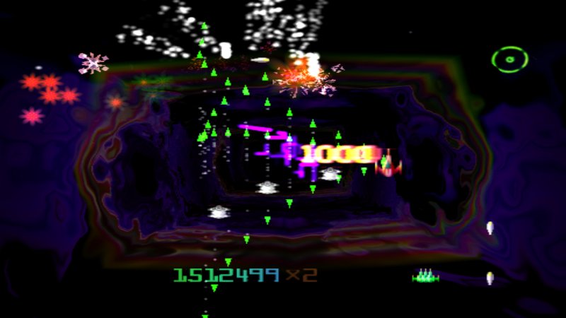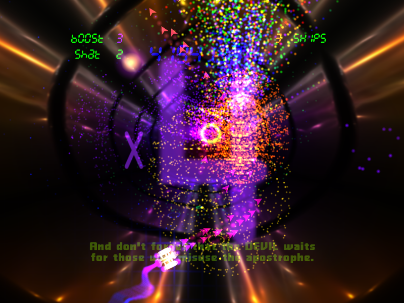 You’ll see it’s running on top of one of the tunnels out of Space Giraffe and using pretty much the identical bitmaps from the older PC game. A couple of new things are already in – the large enumeration of the BM level and the infamous Xbox 360 Ring of Light, of which more shortly. The Ring of Light replaced the giant sheep-headed “Pill” and in fact became a baddie rather than a goodie, as we’ll see.