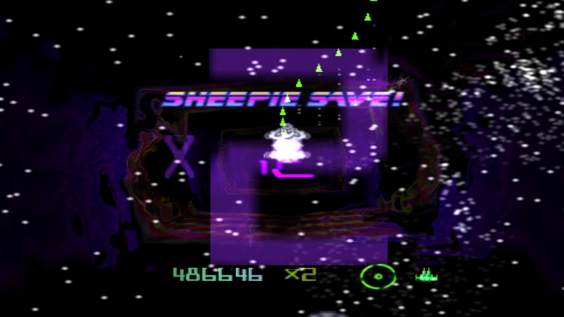 The first thing was some new sprites – here you can see the ship and the sheep are new and much more detailed. We also needed a way of getting the game elements to show up better over the background Neon stack and any explosion effects, so I came up with a shader which would generate an outline around things rendered onto a specific layer in the Neon stack. This was then composited into the final image. You can see the effect of this shader in this image and the following ones.