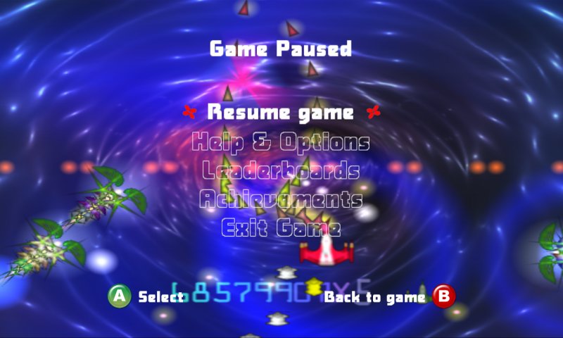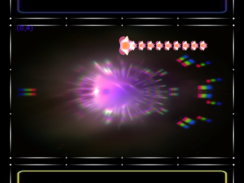 The first step of the game’s evolution was simply to get it working on the Xbox 360. This involved removing all the pixel-by-pixel direct manipulation of the destination bitmap, replacing the sprite and tile stuff with quad-based equivalents and the particle explosion stuff with pointsprite equivalents, changing the aspect ratio of the game from vertically oriented to horizontally oriented, moving the controls from mouse to joypad, and putting it all inside the Neon engine.