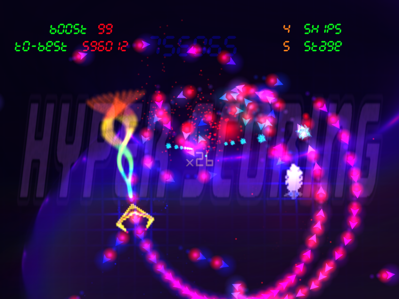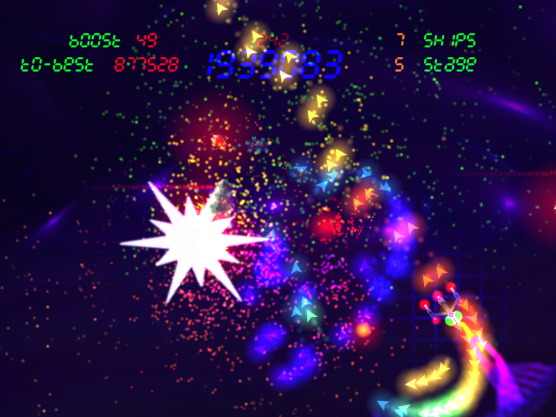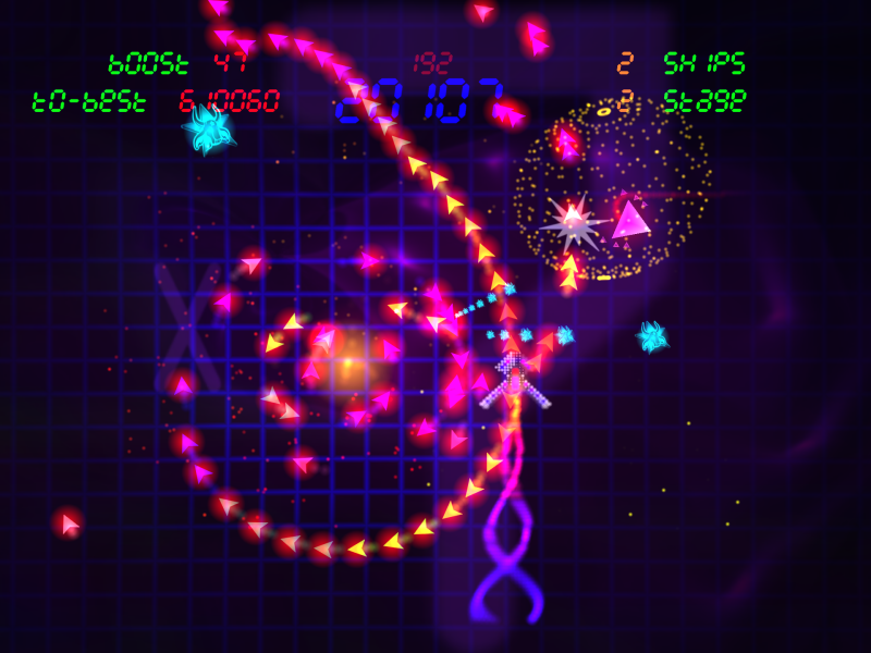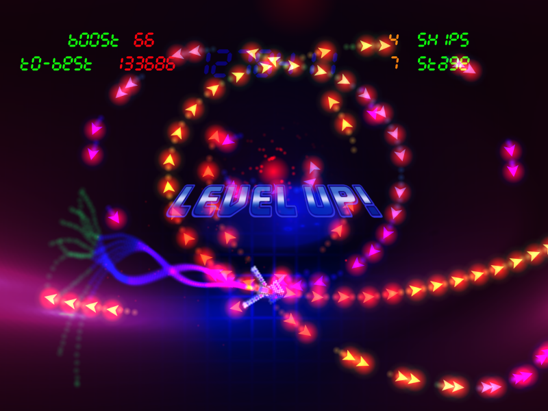 There are both visual and audio cues you can use to tell if you are making a good trajectory without having to constantly look at the Boost gauge - useful when you are also dealing with a screenful of attackers. Whenever the Boost value reaches a new high, you'll hear a sizzling noise, and the bullet trails will pulse with large dots momentarily. As you learn you'll get used to using these cues to guide you towards better trajectories.